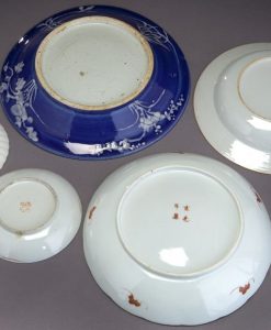 5 Pcs. Chinese Qing porcelain, including: 4 plates and 1 bowl with stand, depicting flowers, bats, peaches and clouds. Smallest: 5″ Diameter; Largest: 11″ Diameter. Circa – 18th-19th C.