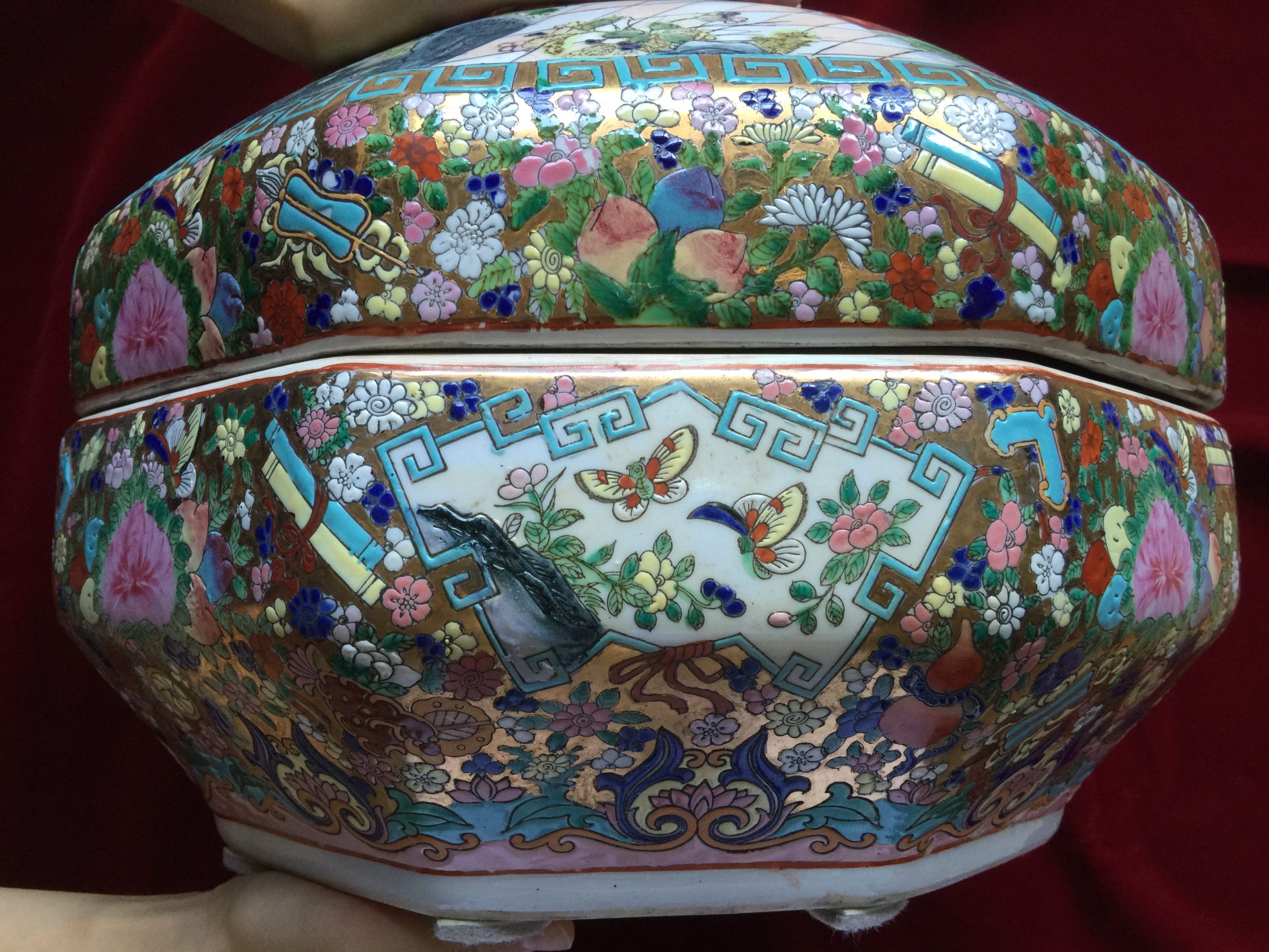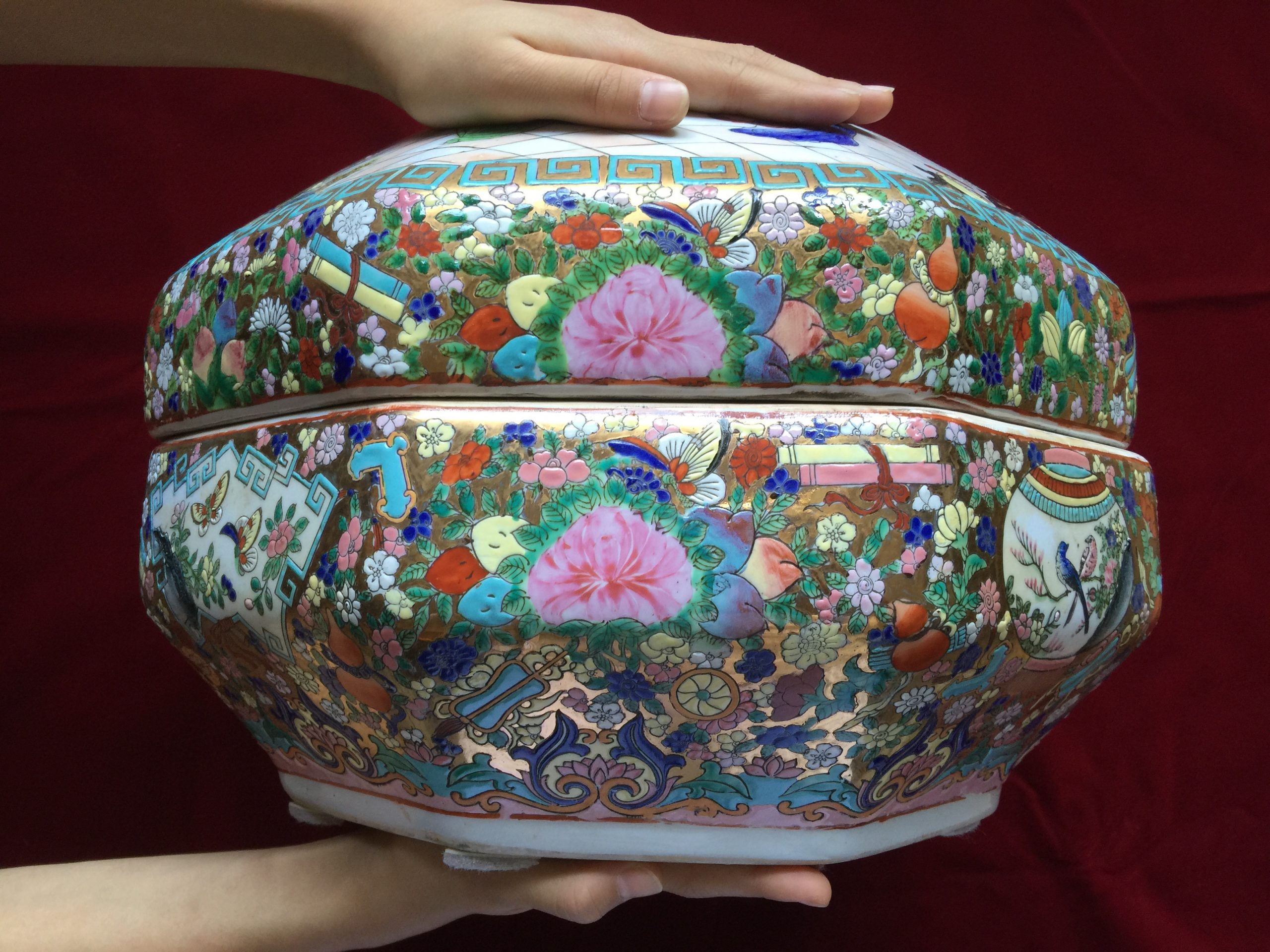 - A very unique Chinese Famille Rose Treasure Pot of Octagonal shape with Lid